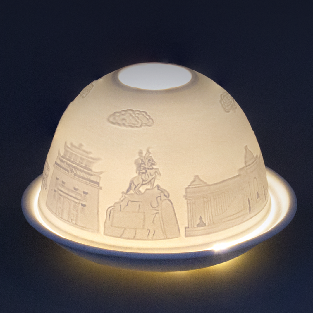 The TUVURGUU collection's DURVUN BERKH Snow Globe feature four sheep anklebones, known as "shagai", gracefully dancing within a cascade of glistening snow. For centuries, Mongolians cherished and used these anklebones from their benevolent livestock to interpret their luck, spirit, and fortune. The name "Durvun Berkh" describes the instance where each of the four ankle bones land on different faces when thrown, with each face having a different name: horse, sheep, camel, and goat. Additionally, the base of the globe is beautifully adorned with the Mongolian traditional "Tumen nast" pattern, taking inspiration from the iconic Mongolian silver cups, connecting the modern snow globe to the timeless symbols of Mongolian history.